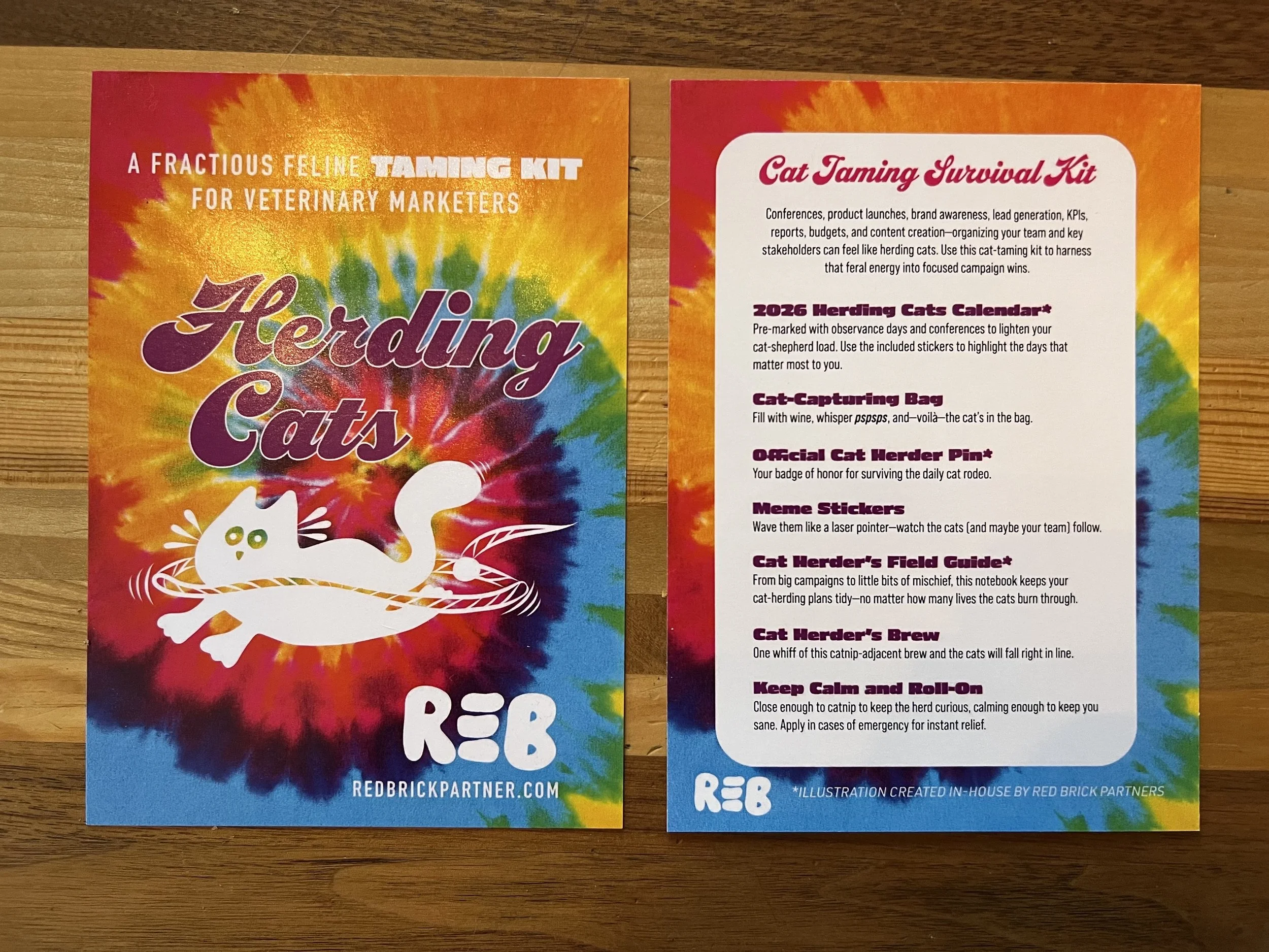 The Red Brick team is excited to announce that our marketing campaign has been recognized among the best in the animal healthcare industry. Red Brick Partners was awarded a Gold VETTY in the category of Agency Self Promotion for our “Herding Cats” Direct Mail Box.